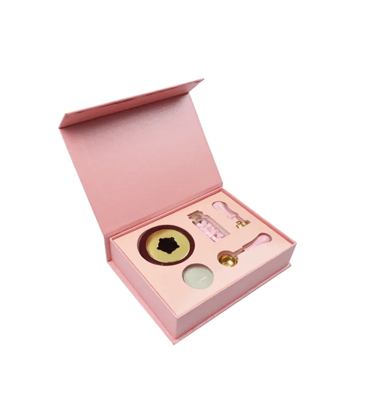 Una caja con un set de lacre que incluye un mechero, una vela, un cuño, una cuchara y perlas.