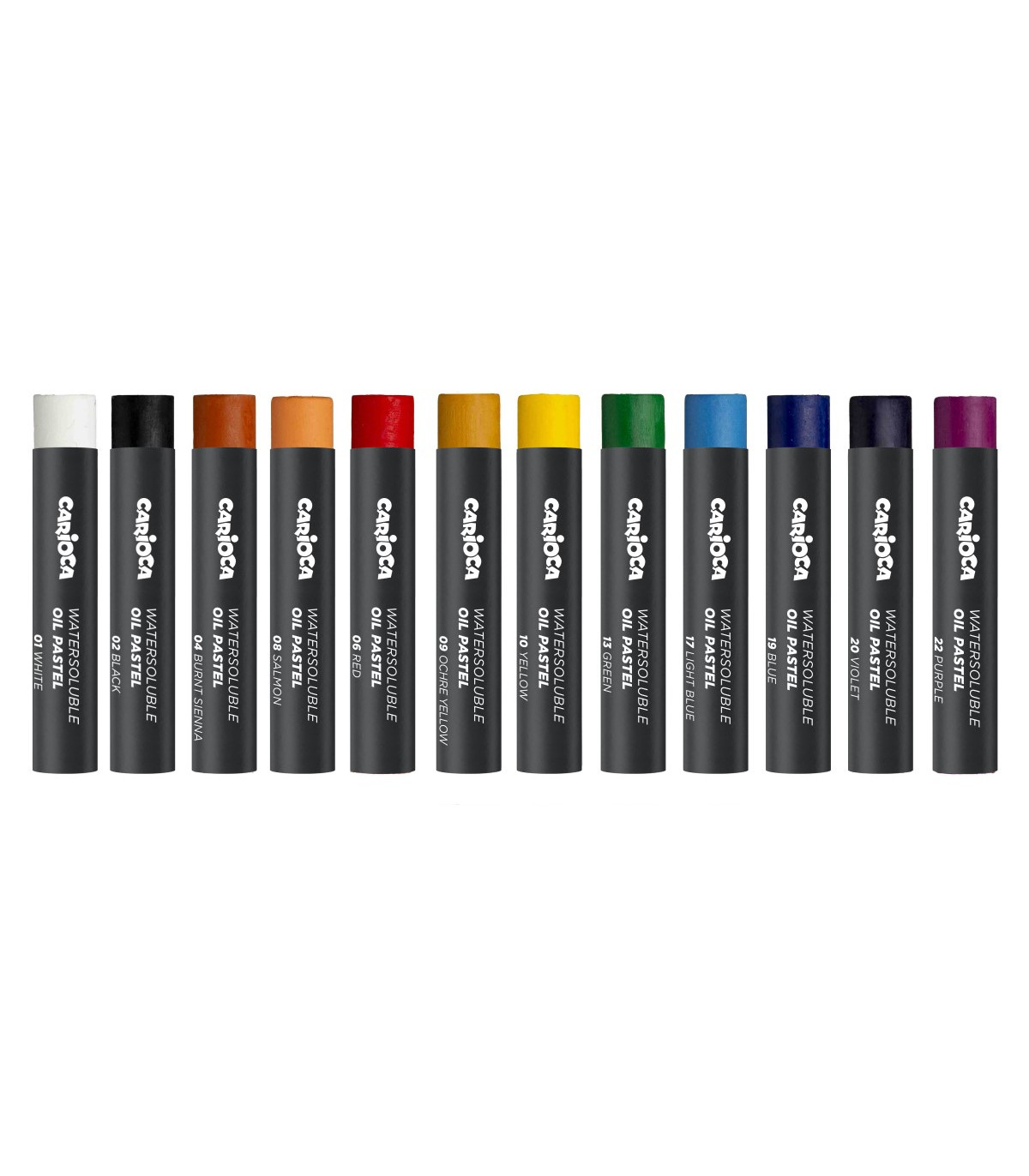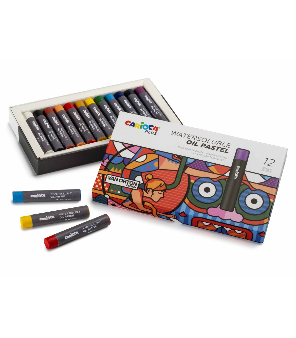 Una caja con 12 pasteles al óleo de trazo súper suave y colores brillantes y opacos. Solubles en agua.