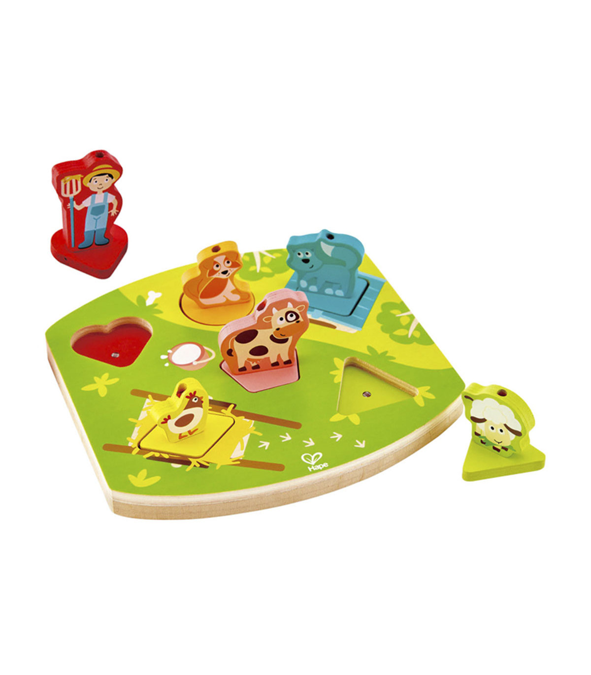 Un colorido puzzle de madera de la granja con piezas 3D para que los chicos puedan jugar con ellas. Además, pueden aprender los sonidos de cada uno poniéndolos en su lugar.