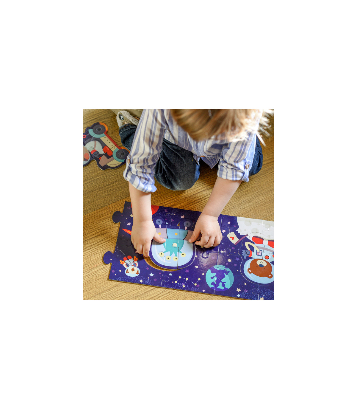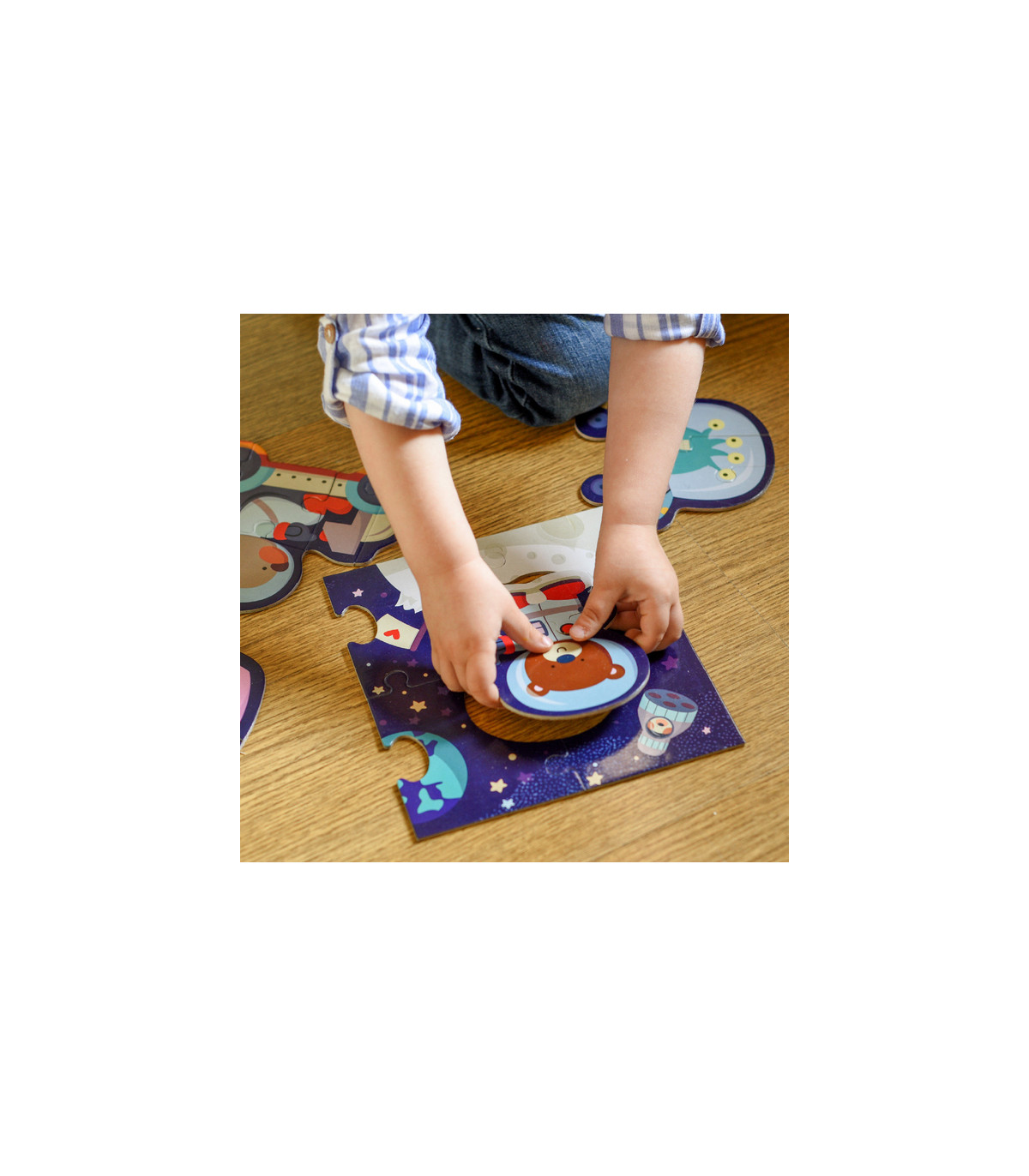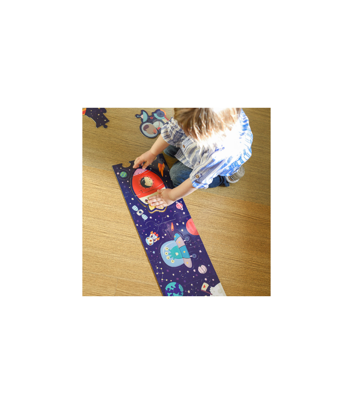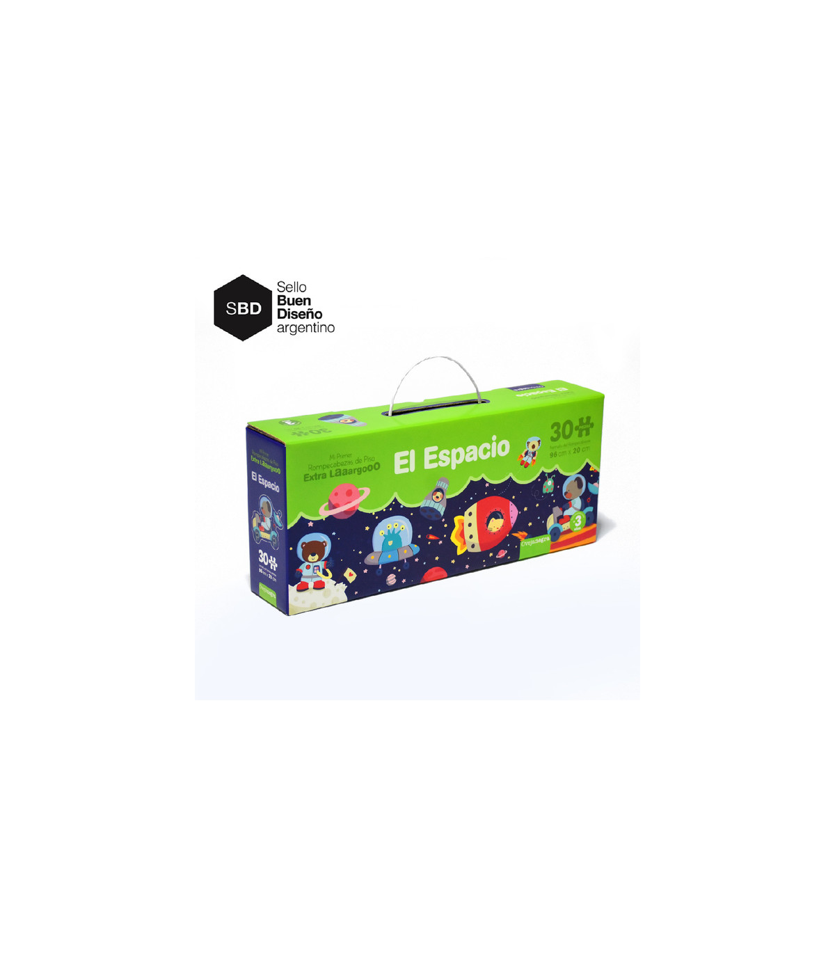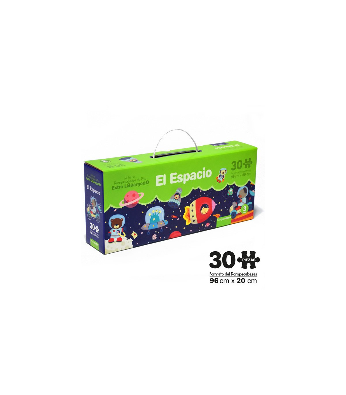 Rompecabezas Extra Laaargo de El Espacio contiene 30 piezas, que incluyen 4 rompecabezas individuales de personajes con forma, que encajan en una escena panorámica