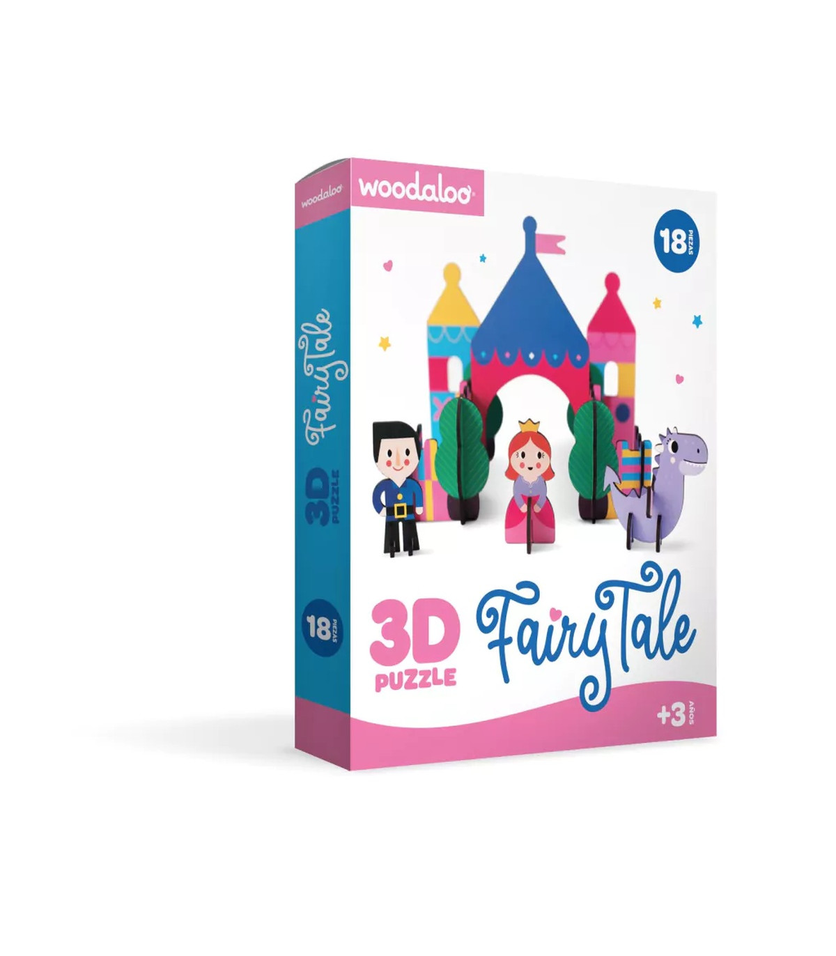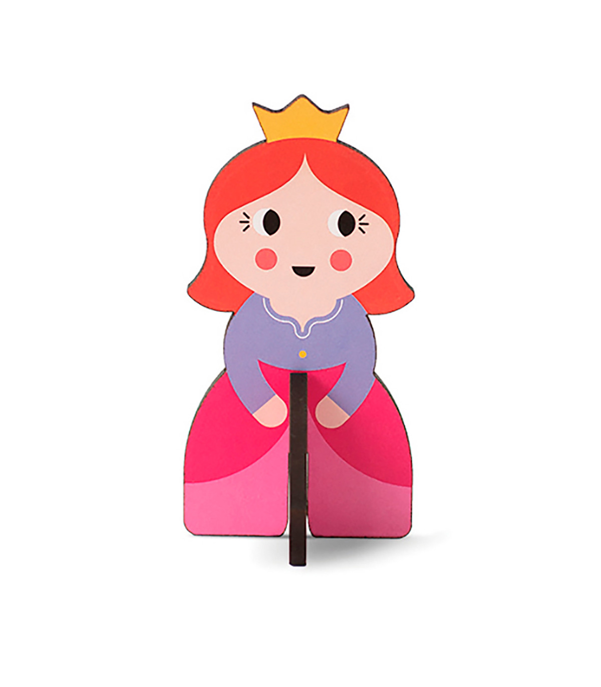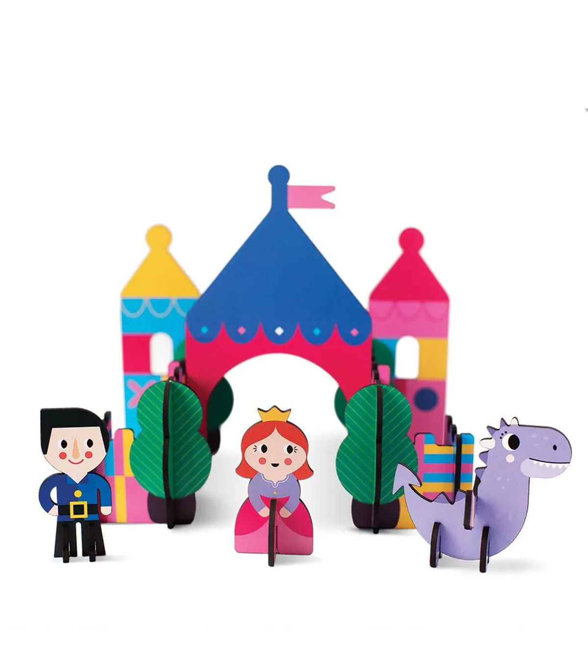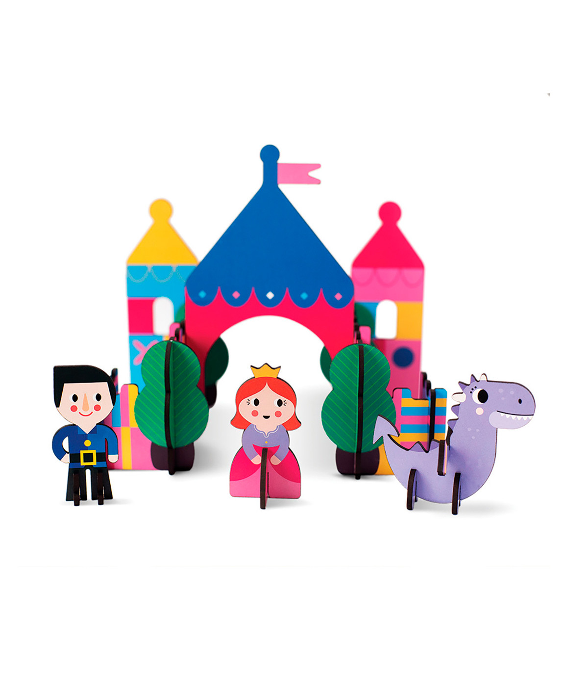 18 piezas para armar 1 castillo, 1 princesa, 1 príncipe, 1 dragón + frasquito con adhesivo vinílico. Material Madera 3 mm de espesor, laminada frente y dorso en papel ilustración, terminación en polipropileno mate para mejorar su conservación.
