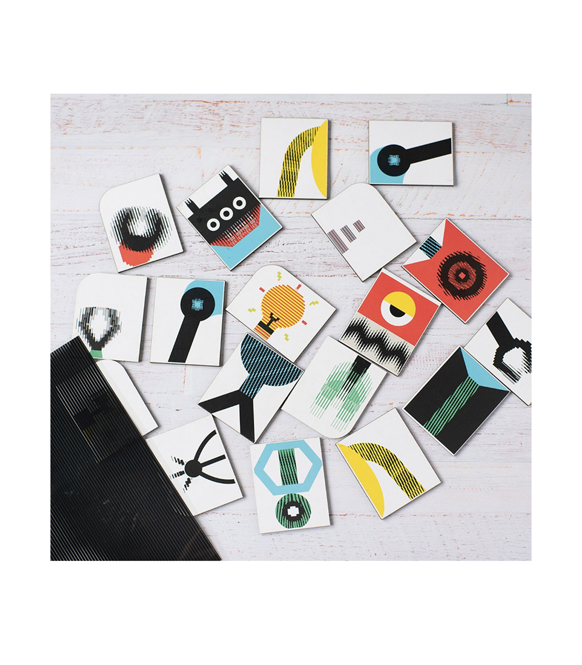 Piezas reversibles 6,5x8,2 cm. Material Madera 3 mm de espesor, laminadas frente y dorso en papel ilustración, terminación en polipropileno mate para mejorar su conservación. Filmina acetato transparente. Packaging de madera guatambú con tapa deslizable.