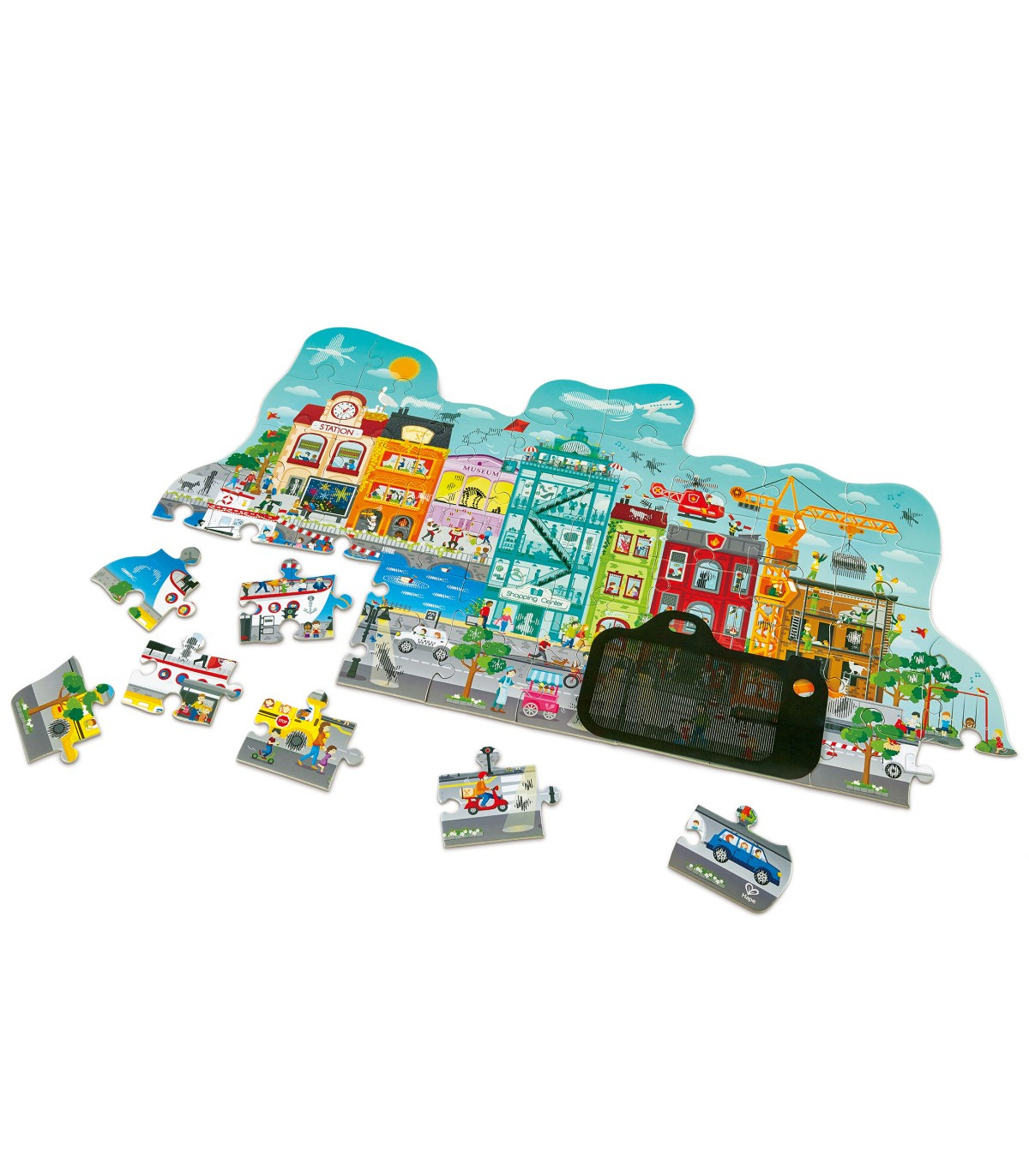 Un gran rompecabezas de 49 piezas de una ciudad con un visor de cámara con tarjeta mágica, que crea efectos animados a medida que lo movés por la imagen.