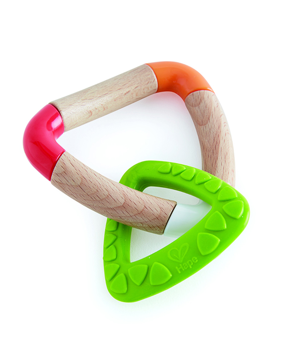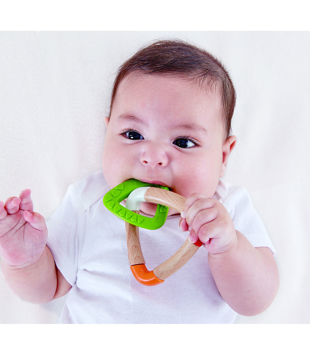 Este mordillo brinda alivio al bebé cuando comienzan a salir sus pequeños dientes. El mango de madera es agradable de tocar y seguro para masticar, y el triángulo de dentición está hecho de silicona libre de BPA.