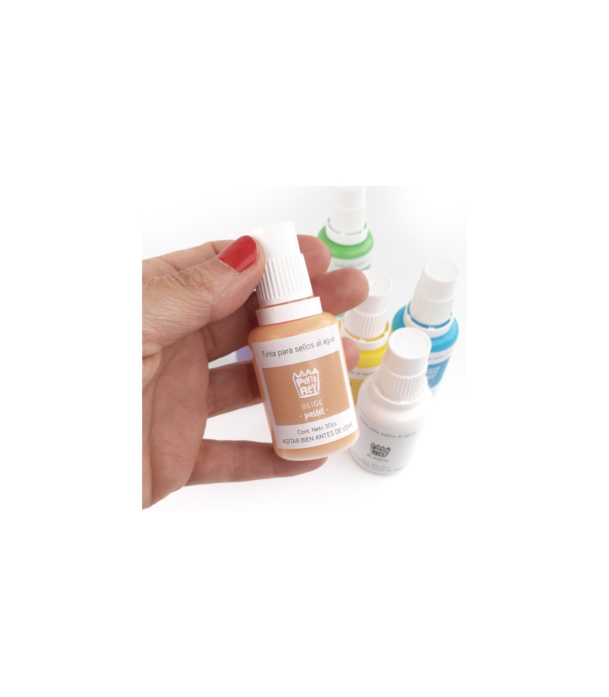 Botellita de 30 cm3, contiene tinta en base al agua color Beige para sellos de goma, aptas para papel y cartón.