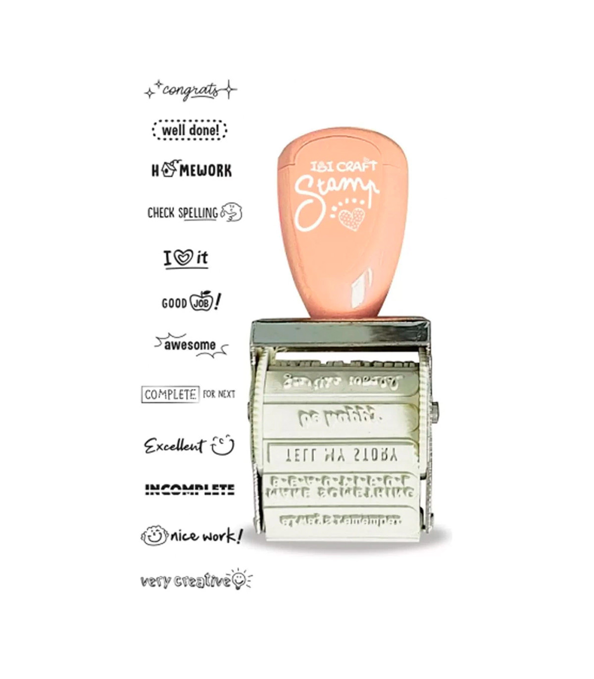 Un set que incluye sello rotativo y almohadilla entintada. El sello incluye 12 motivos con diseños creativos y divertidos para maestros con leyendas en inglés para motivar a sus alumnos que se pueden elegir girando la rueda del sello.