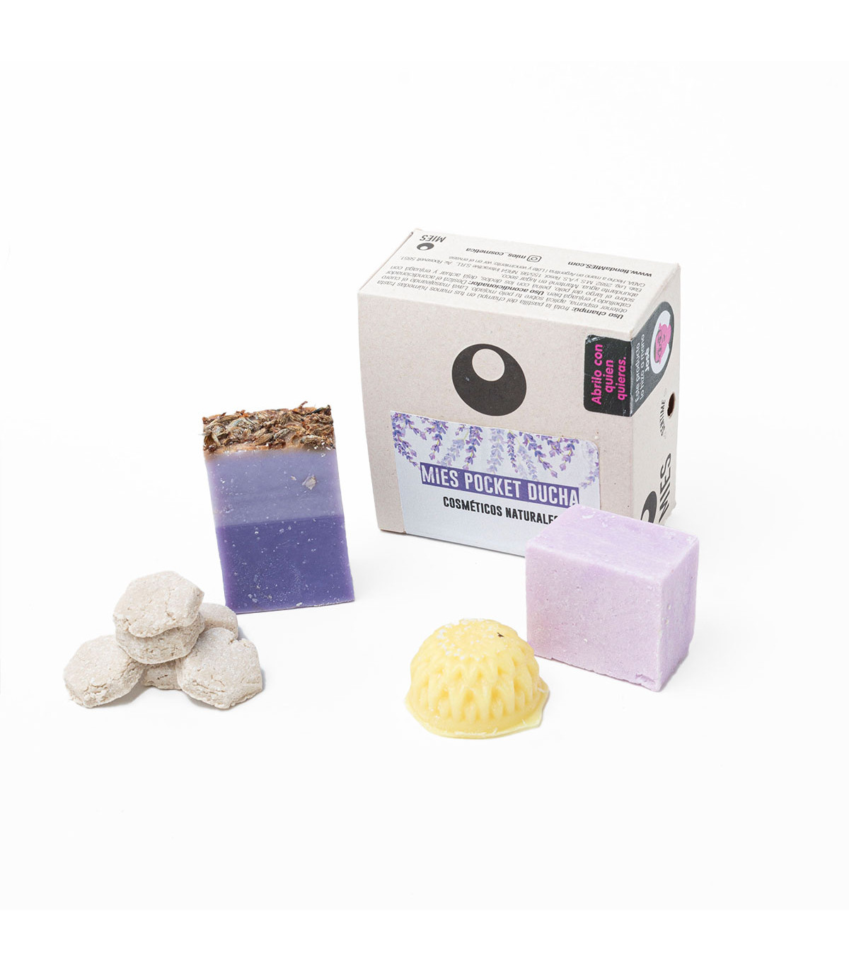 Una caja con los esenciales de Mies para la ducha, ideal para llevar de viaje. Incluye un champú sólido de lavanda, un acondicionador sólido de ricino, un jabón sólido de lavanda y exfoliante en pastillas.