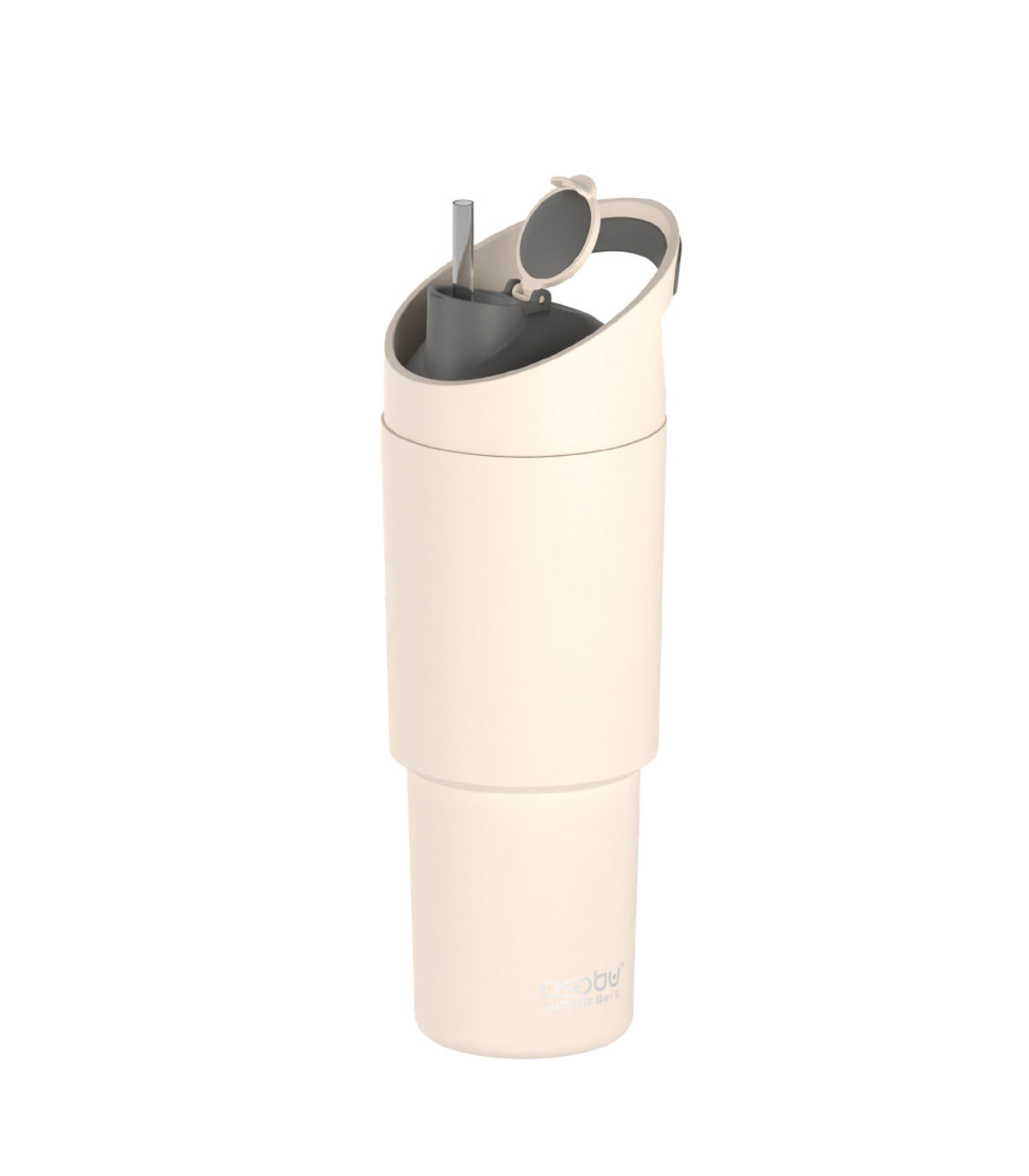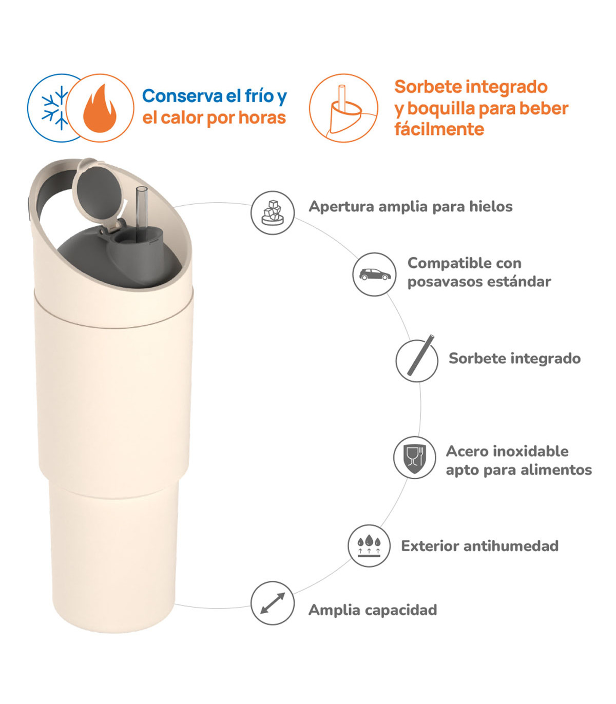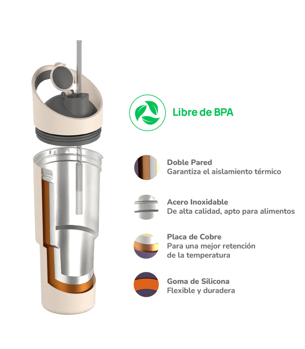 Botella de 1 litro con estilo y funcionalidad. Mantiene la temperatura perfecta por su diseño de pared doble de acero inoxidable. Tapa de fácil apertura que incluye un sorbete integrado y manija que garantiza un agarre seguro. Ideal para hacer deporte.