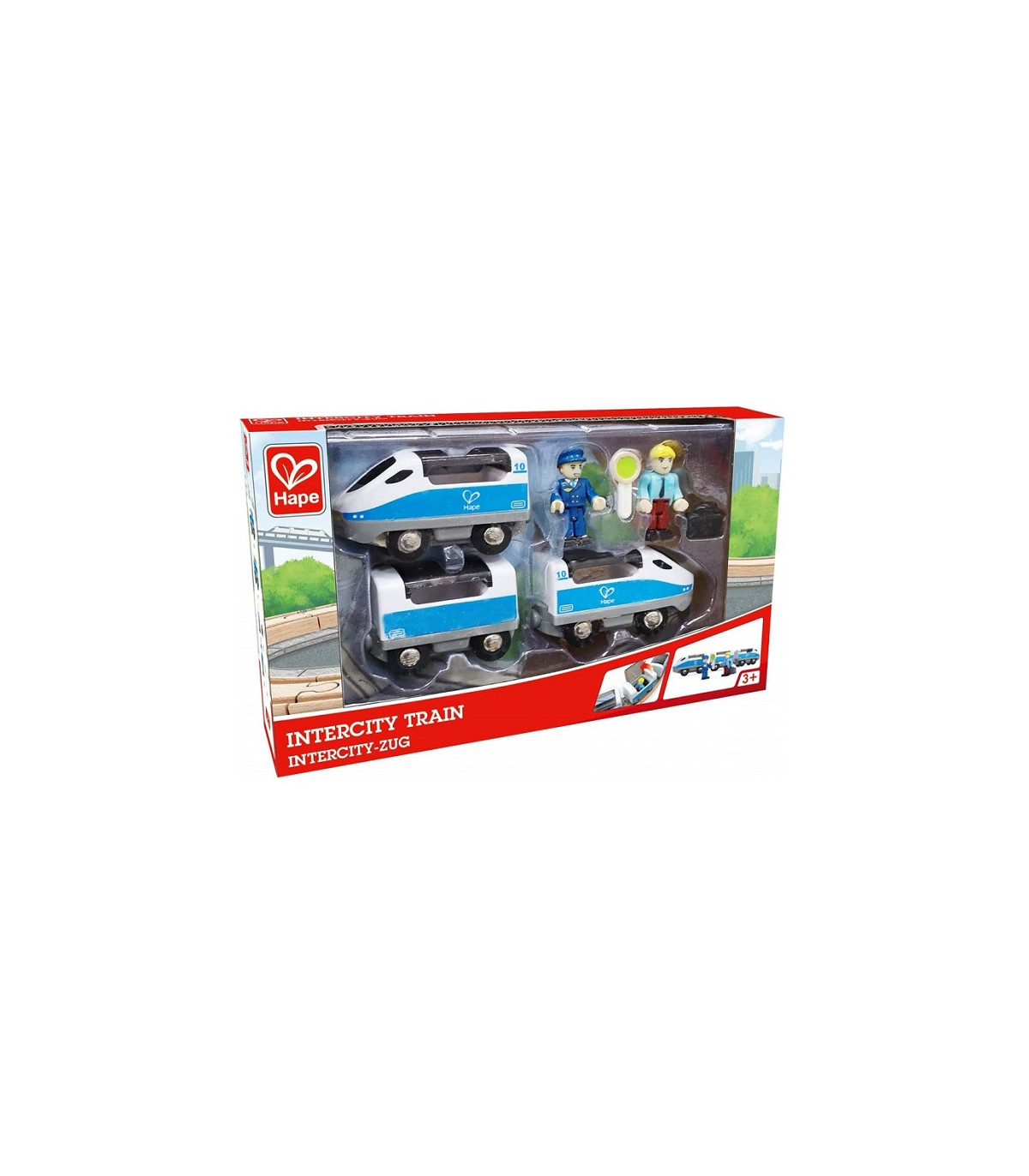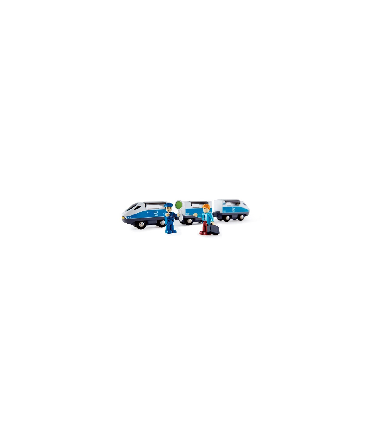 Este rápido tren tiene mucho espacio para un conductor y un pasajero con equipaje. Los imanes mantienen los 3 vagones unidos y hay una señal de advertencia para mantener a todos seguros.