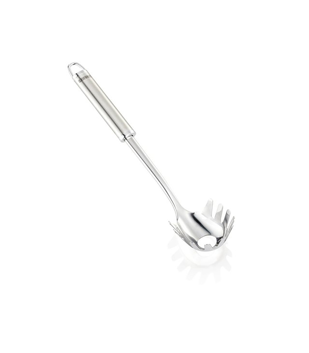 Cuchara de fideos diseñada y realizada en acero inoxidable, pensada no solo para al momento de sacar una deliciosa pasta de coccion ,sino para dosificar la pasta en el plato gracias a su superficie cóncava dentada.