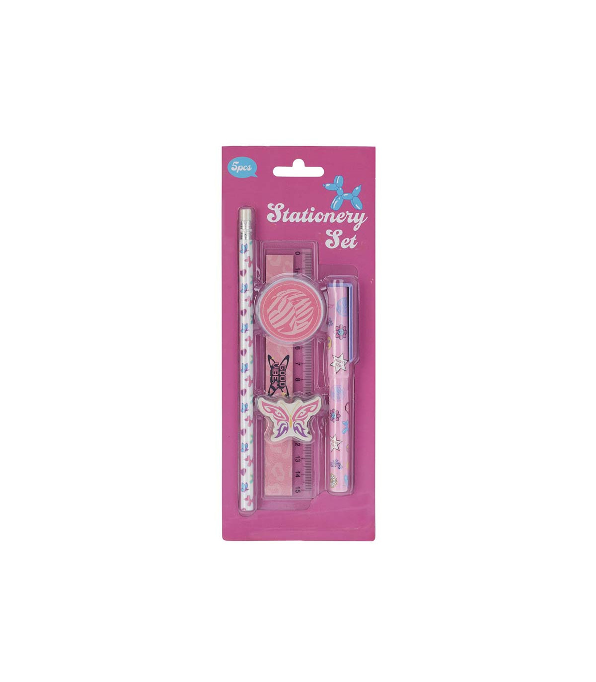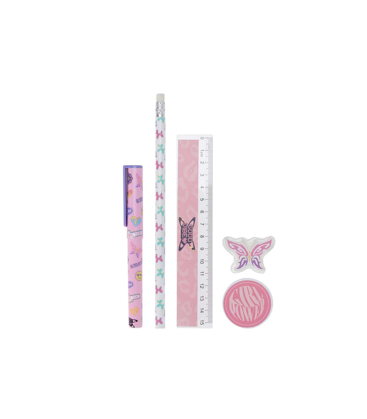 Un kit de 5 útiles escolares de la colección Butterfly que incluye un lápiz HB con goma de borrar en la punta, una regla de 15 cm, un sacapuntas, una goma de borrar con forma y una lapicera.