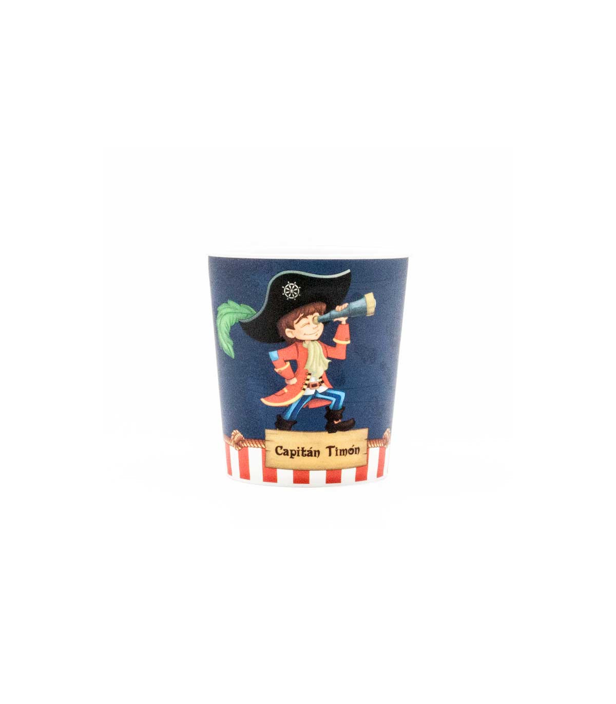 Un vaso plástico de 350 cm3 impreso a 4 colores con motivo del pirata Capitán Timón.