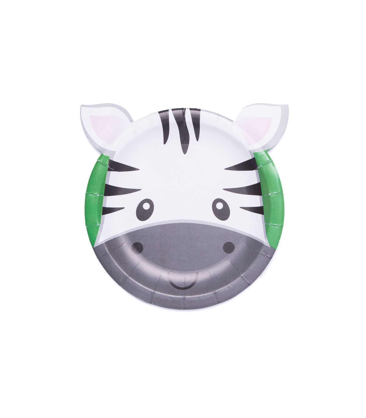 6 platos de cartón de 18.5 cm de diámetro con motivo y orejas de cebra para decorar la mesa en fiestas de cumpleaños. Descartables y biodegradables.