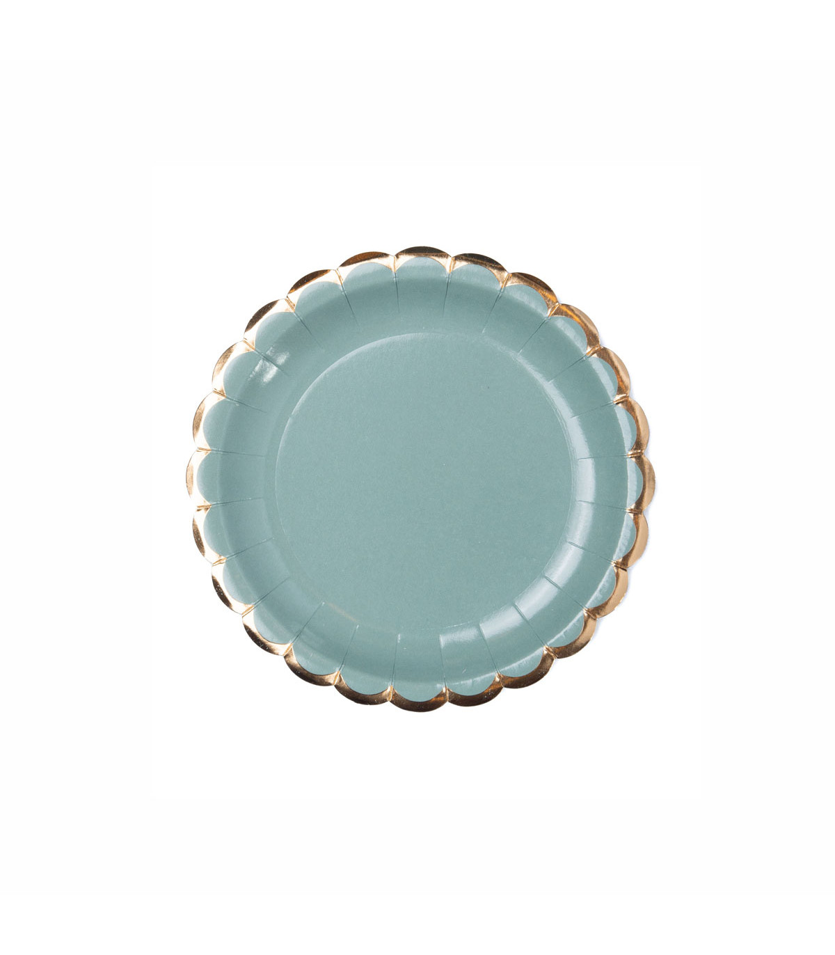 8 platos de cartón de 18 cm de diámetro con stamping dorado para decorar la mesa. Descartables y biodegradables.