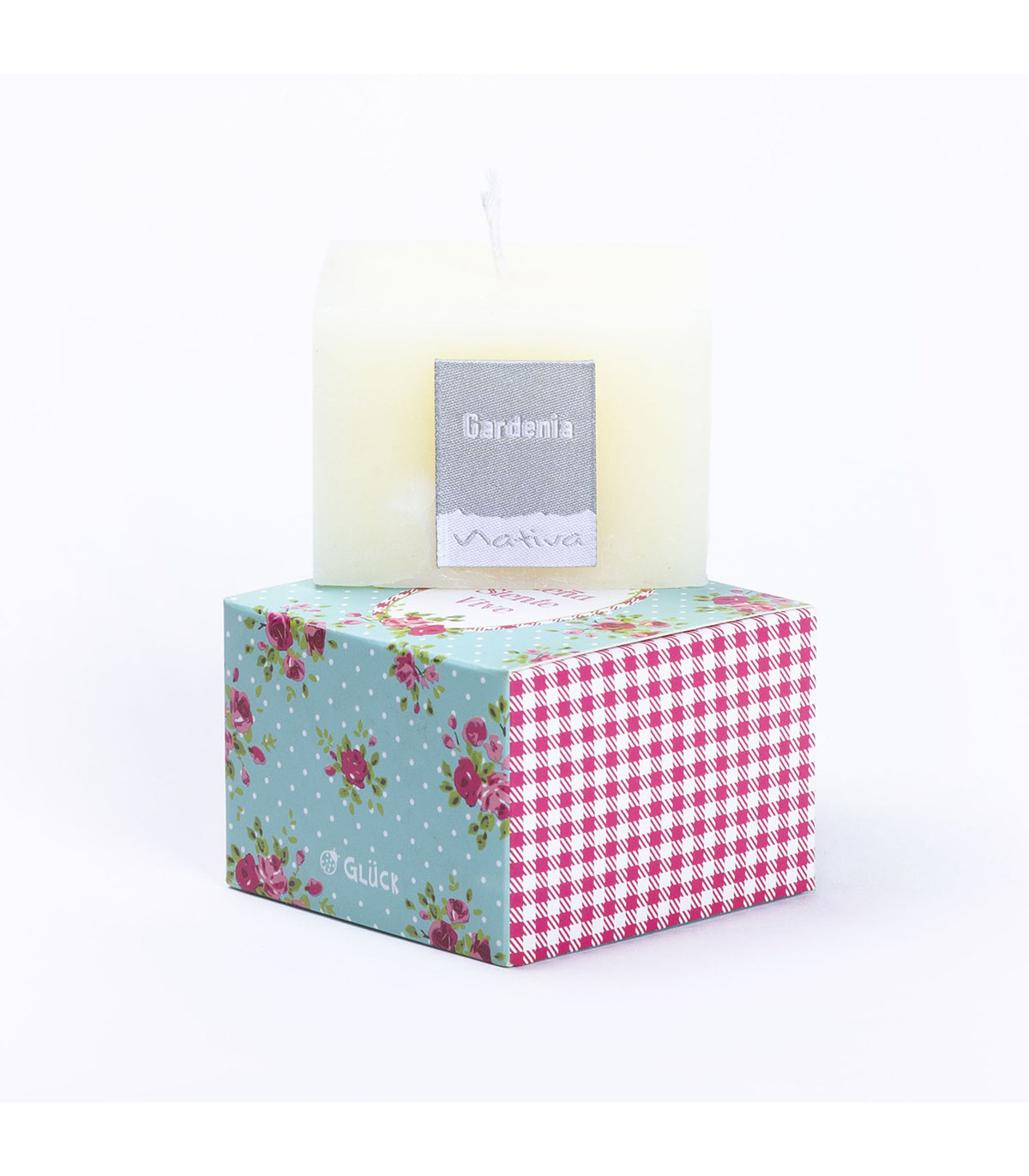 Una caja-tarjeta con un mensaje para dedicar que contiene una pequeña sorpresa, una vela cuadrada con fragancia gardenia. Medidas: 7 cm de base x 5 cm de alto. Colección Mensajes para el alma.