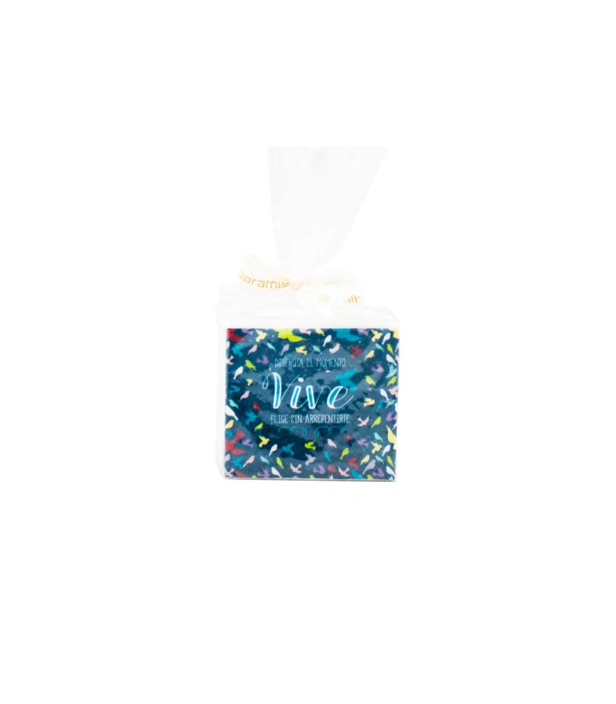 Una vela fanal cuadrada de 8 cm de lado y 7 cm de alto con decoupage de motivos de la colección. Colección: ?Simples secretos? Diseñó: ?Vive?