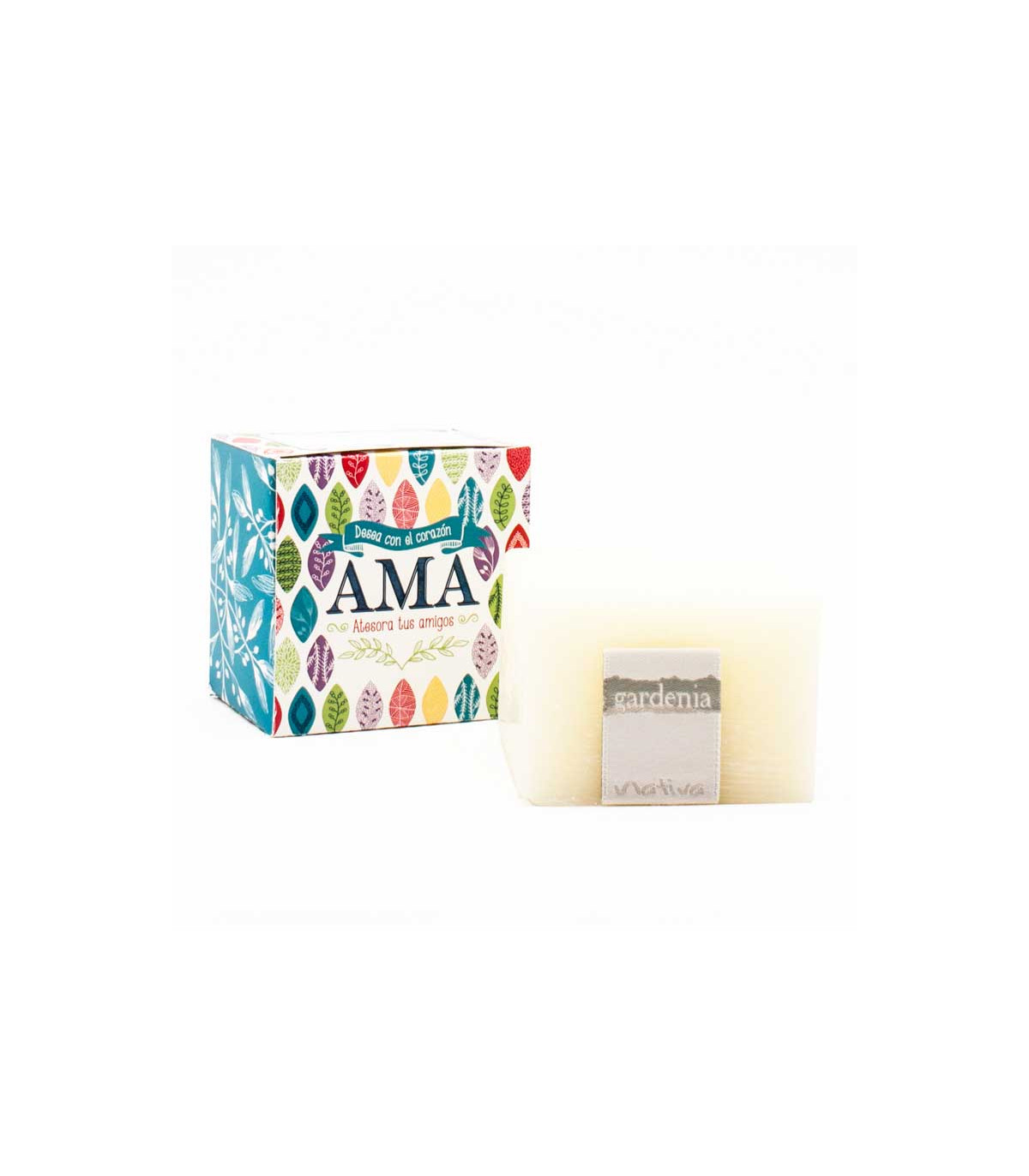 Una caja-tarjeta con un mensaje para dedicar que contiene una pequeña sorpresa: una vela cuadrada con fragancia gardenia. Medidas: 7 cm de base x 5 cm de alto. Colección: "Simples secretos". Diseño: "Ama" con trama de hojas de colores.