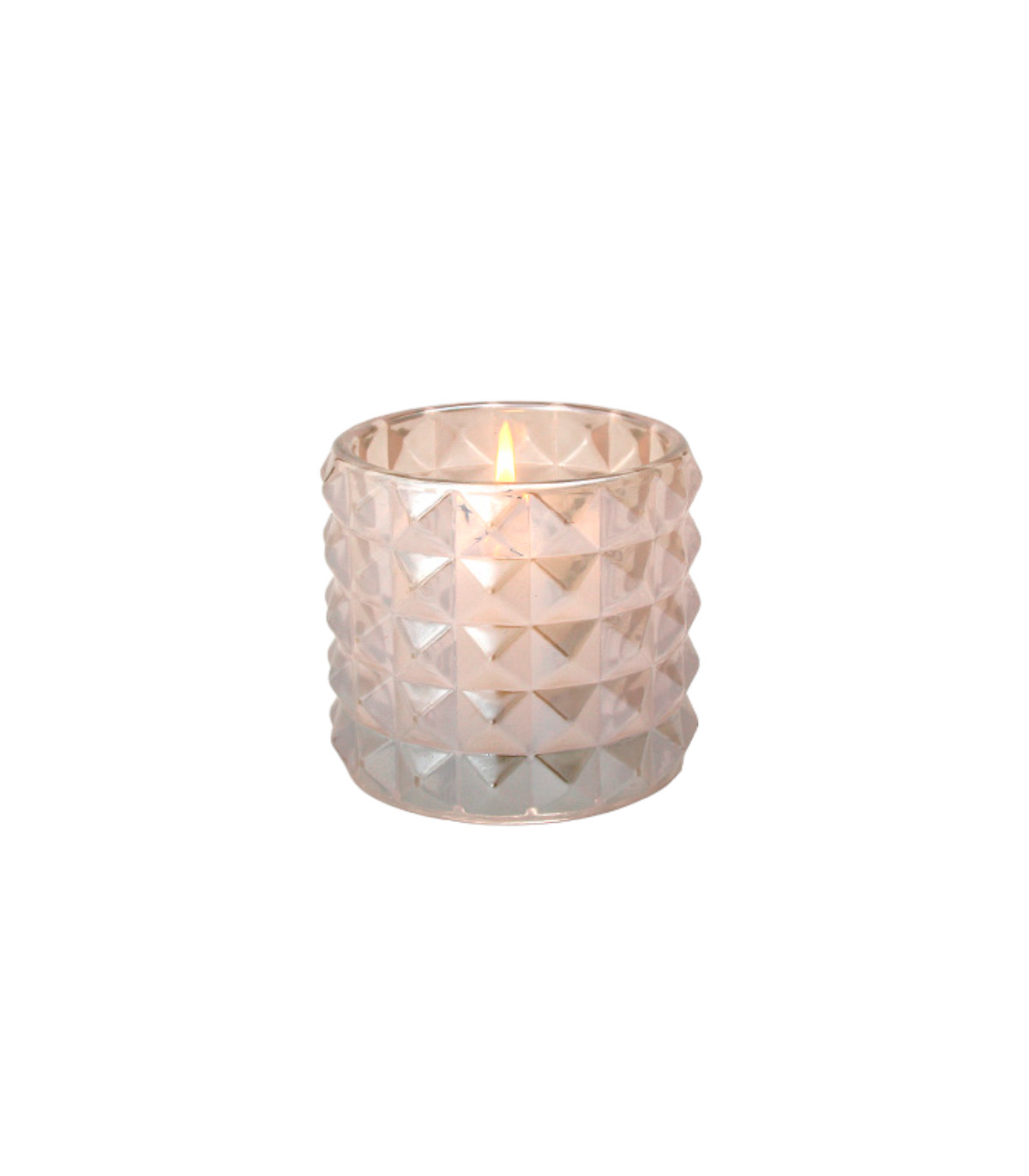 Un fanal de vidrio facetado de 11 cm de ancho y 11 cm de alto. No incluye vela.